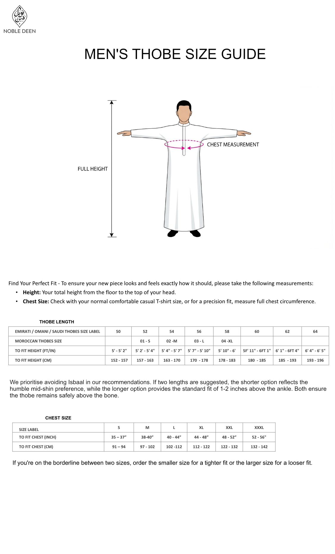 We prioritize avoiding Isbaal in our recommendations. If two lengths are suggested, the shorter option reflects the humble mid-shin preference, while the longer option provides the standard fit of 1-2 inches above the ankle. Both ensure the thobe remains safely above the bone.