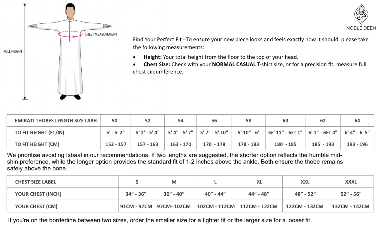 We prioritize avoiding Isbaal in our recommendations. If two lengths are suggested, the shorter option reflects the humble mid-shin preference, while the longer option provides the standard fit of 1-2 inches above the ankle. Both ensure the thobe remains safely above the bone.